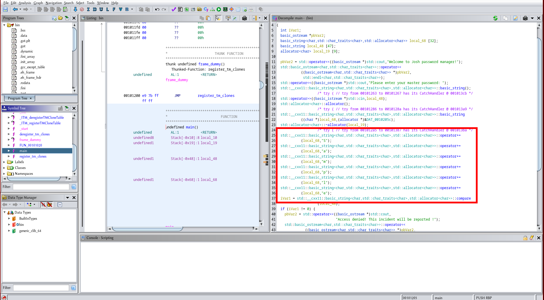 screenshot of ghidra where the master password can be seen in the decompile window
